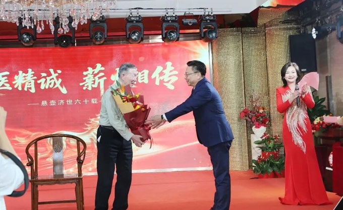 现场还特意插入首都国医名师冯兴华教授悬壶济世六十载庆祝仪式。赵永林董事长向恩师冯兴华教授敬献鲜花,恭贺其深耕中医传承一甲子,同时致以诚挚谢意。冯兴华教授则寄语,中医药文化的传承,唯有坚守岐黄初心,以仁心为根本、以精研为要务,在守正创新中行稳致远。